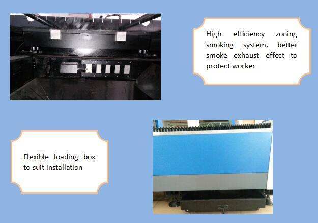 3. இயந்திர உடலின் இருபுறமும் உயர் திறன் மண்டல புகைபிடித்தல் அமைப்பு, வலுவான பிரிக்கப்பட்ட தூசி மற்றும் புகைபிடித்தல் சேகரிப்பு, இது தொழிலாளிக்கு தீங்கு விளைவிக்கும்.